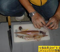小樽フイッシングパパの釣り情報です。 詳しい情報は当店まで! <まことさん情報> 専務にも電話したけど今日の南防は大混雑! 早くも昨日の釣果が広まったのか、19時にはすでに満員。 空いてるのは浅い根元寄りの方のみでした。 私はうまい具合に空いていた堤防真ん中あたりに陣取り準備開始。 小娘のエギを諦めてウキ&エサ釣りにしました。 磯竿に2号の電気ウキ+ヤマシタのエサ巻きテーラーです。 肝心のエサはパパで買った冷凍チカ。 サイズも小ぶりでピッタシ(笑)でした。 ってなことで19時半にはキャストしましたが、なにしろ満員で2本投げられない… 仕掛けはセットしたものの1本は帰る直前まで使えませんでした。 キャストできた1本に最初のヒットがあったのは8時ころ。 まだ小さかったですが、元気に水を吐いて上がってきました。 それから11時頃まで飽きない程度にポチポチと上がって15杯ほどになりました。 11時を過ぎるとアタリは止まり、後は忘れかけた頃に上がる程度。 それでも5杯ほど追加し20杯(+5杯バラシ(^^ゞ)になったところで納竿しまし た。 そうそう、途中でマルシィさん登場。 先端まで人がいっぱいなので根元に戻って行かれましたが、さすがはドン・ゴルゴ (笑)、私よりは上げていたはずです。 ほかにもガンダムさん、大麻さん、ジンさんも登場。 ガンダムさんはパワーにものをいわせて大遠投! 計30杯くらいは上げていたようです。 大麻さんは花畔@石狩を偵察するも釣れてないので急遽小樽へ出撃。 5〜6杯ほどゲットされて帰りました。 ジンさんは…会ってないので分かりません(^^; 翌朝高島で釣るために車で仮眠中だったようです。 そういえば今日のイカはエサを食う場所がいつもと違うみたいでした。 普段は頭の方をかじるのに、今日のは尻尾ばかりかじられてました。 釣る方にとっては針がかりしやすくていいんですけどね。 これに気が付いてエサの位置を後ろにずらしたら釣果が伸びましたよ。 ちなみ同じチカをエサに使っていても周囲の泳がせや竹串に刺すタイプの仕掛けを 使ってる人は2〜3杯しか上げてませんでした。 エサ巻きテーラーが有効なようです(さすがヤマシタ(笑)) で、私が釣った20杯は帰宅後すぐに写真の通り沖漬けになりました。 醤油と酒だけの おかっちさん方式です。 おかっちさん、ありがとう! 明日が楽しみ〜 では、おやすみなさい(-_-)ヌヌヌヌヌ・・・・ |