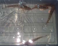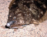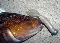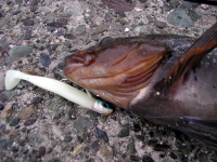 ![]() ジグヘッドのオモリの部分までパクリ!31cmのヒラメ。 ![]() さぁ問題のワームです。何でしょうか? ![]() ヒラメの口ですね。凶暴そう。歯も鋭い! |