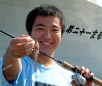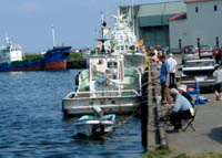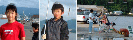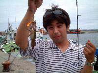 北浜岸壁 ハゼ 10〜12cm 10〜15匹 チョイ投げ 当店手造り仕掛、ブラー、ブラクリ等にイソメ2cmに切って使用。PM1:00より好調。食いが立つ。北浜でハゼ釣りを楽しむショータくんを発見。当店手造り仕掛でGET。